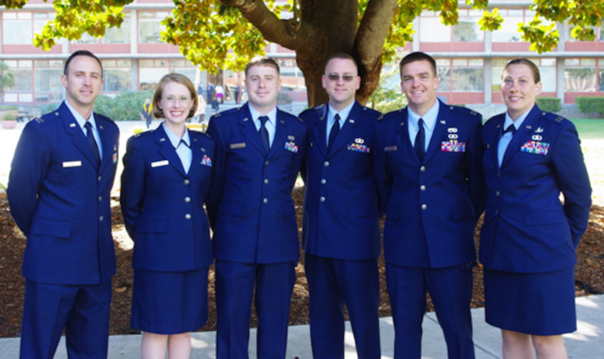 MONTEREY, Calif. -- Capt. Sean Wile, Capt. Stephanie Hedstrom, Capt. Nicholas Reitz, Capt. Paul Hayes, Capt. Daniel Muggleberg and Capt. Chandra Pasillas pose following their recent graduation from the Meteorology Operational Sciences curriculum of the Naval Postgraduate School. (Courtesy photo)